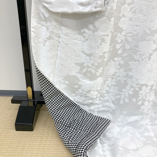 化繊白無垢「枝垂桜花ノ丸」の裏をちりめんの千鳥格子に。