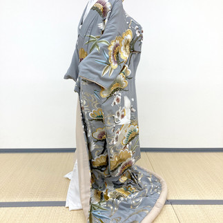 銀鼠色(ぎんねずいろ)のちりめん地に、重厚な刺繍で図柄を表現した打掛。